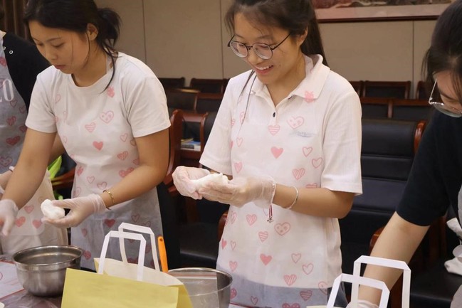 会议伊始,谭瑾老师向所有参会的同学表示亲切慰问与关心,并致以节日的问候,希望来自不同省份的45名少数民族学生在学院感受到家的温暖。随后,新生代表逐一介绍了自己民族的特色风俗及入校以来的感受,大家纷纷表示盐城是一个打开心扉的城市,盐师也是一所温暖的大学。座谈会现场气氛活跃,与会同学踊跃发言,党委书记刘洋对同学们提出的相关问题做出说明和解释,并激励同学们进入大学要尽快适应和转变,树立自信、自立、自强的观念,关注自我成长发展,确立目标不断奋进,实现由内而外的蜕变。随后,在专业甜品师傅的指导下,同学们一同参与月饼制作,从揉面、包馅到压模,每一个步骤都充满欢声笑语,大家共同感受着传统节日的氛围。
