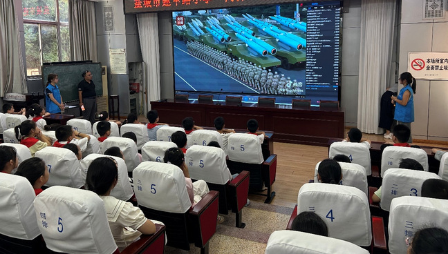 活动以气势磅礴的九三阅兵视频拉开帷幕,孩子们目不转睛地看着屏幕,视频里整齐的方阵、先进的装备,无一不让他们直观感受到中国国力的日益强盛,宣讲团巧妙地以此引出了在艰难岁月中孕育而生的“两弹一星精神”。