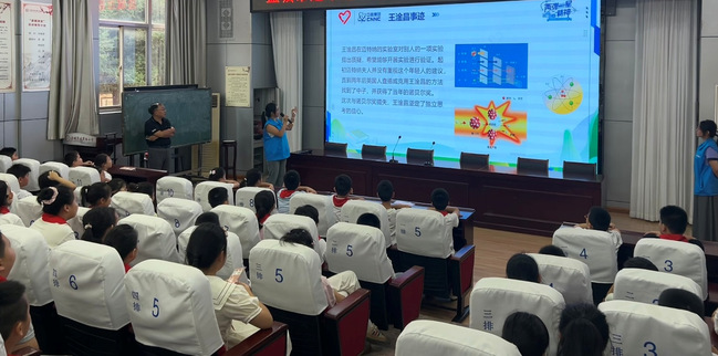 在“功勋的故事”环节,宣讲员深情讲述了王淦昌隐姓埋名、以身许国的感人事迹,郭永怀放弃海外优厚待遇毅然归国、在生命最后一刻仍以身体守护国家机密文件的壮烈人生。孩子们凝神倾听,眼中闪烁着敬佩与思考的光芒。